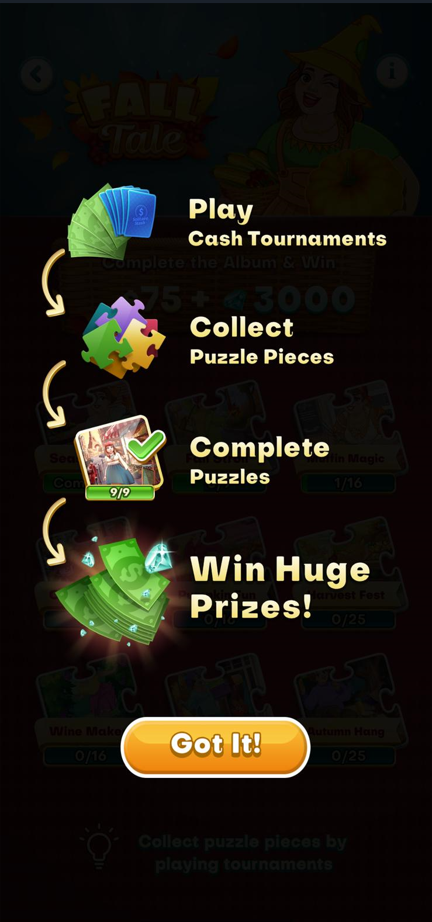 Collect puzzle pieces as you play Solitaire tournaments. Solve the puzzle and win the cash and gems prize!