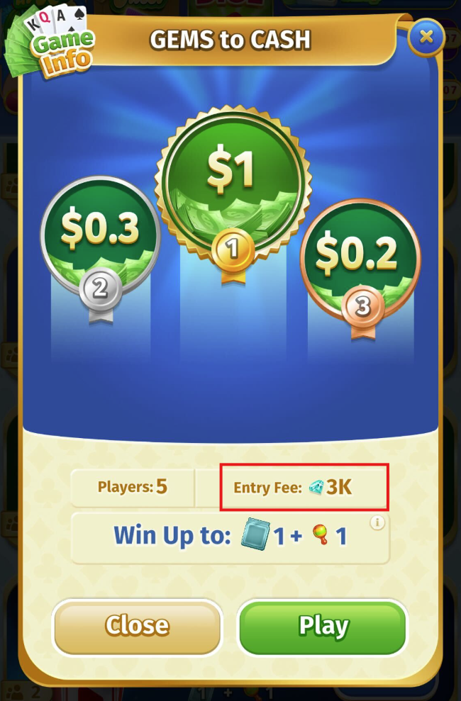This tournament entry fee is gems, but the prize is cash, so if you win, you can start playing for real money.